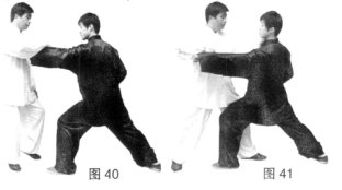 (3)甲沉腰松胯侧身下沉,右手由外向内划弧勾挂乙来拳。(图40)