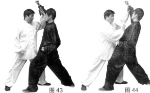 (3)甲沉腰松胯同侧手经胸前划弧上掤乙手臂,随之进步后手按击乙胸腹部。(图43、44)