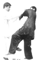 (4)随之中心上提,左脚尖内扣向后、向上勾挂乙右脚,左手向左引化,右手向前按击、(图51)