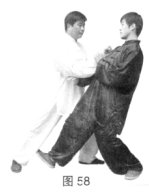 (3)甲侧身下沉,双臂下压捋带乙手臂,使其劲落空,同时进步双拳击打乙胸。(图57、58)