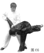 (4)左腿顺势向后别靠乙右腿,身体右转,两手借助乙劲合力向下採按乙手臂。(图66)