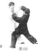 (4)随之甲右脚向右前进步,左脚跟步成左虚步,身体右转,两手顺势向右前捌按乙右臂,(图69)
