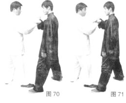 (2)甲上步右手冲拳,攻击乙胸口,乙侧身上步,右手拿握甲右手腕部。(图70)