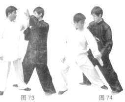 上右臂劈右掌,攻击乙面部。(图73)