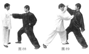 (2)乙右脚进步成左弓步,冲右拳击打甲胸部。(图88)