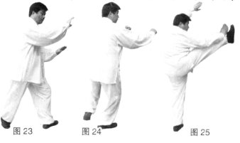 (2)上动不停,松腰落胯,重心移至左脚,右脚虚步上踢;同时两拳继续向下向左划弧,两拳变掌,左掌架于身体左上方,右掌向下拍击右脚脚面。(图25)