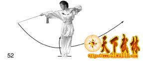 1、上体向右转。左脚向右前方上步,脚尖向内扣落地。同时右手持剑使下剑刃领先向右摆,手心向下;左手剑指向左撑开,手心向下。目视剑身(图51)。