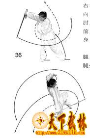 2、上体向左转。左脚向前落地,脚尖向外撇;随之右脚向前上步,脚尖向内扣,两腿屈膝。同时右手持剑使剑尖锋领先向左前下挂;左臂屈肘,左手剑指收至右肩前,手指向上。目视剑身(图36)。