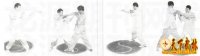 1、预备式 两脚并拢,身体直立,右手持鞭把段,鞭贴于右臂外侧,鞭梢端触地立于右脚旁10公分处,目视前方(图1)。 2、左背 左脚向前上步成左弓步戳,随即右手松开鞭杆,左手握鞭梢段,由下向上甩起,使鞭背在左臂后,随即右手在左肘下接握鞭把段,目视前方(图2-5)。