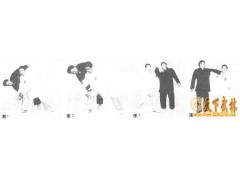 一、青龙出水拿指腕法 当乙方(着黑衣者,下同)上左步用右手推甲方(穿白衣者,下同)时,甲方划圆引化,双手拇指前顶按乙方手背,小指下采里勾,两劲合住(图1),前推至乙方右胯旁。 当乙方上右步用右手抓甲方右腕时,甲方上右步,右手从下向上抓乙右腕内旋,左手里抓上顶