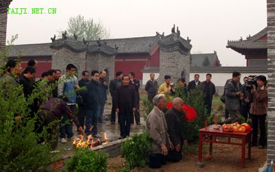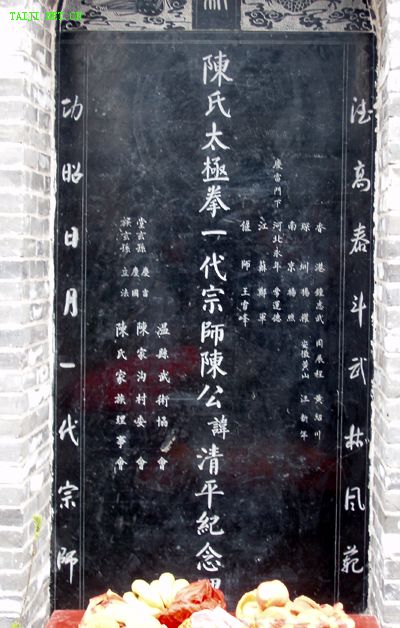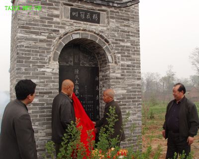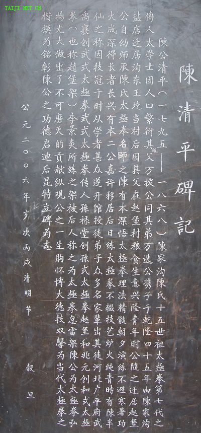 4月3日上午,清明节前夕,在太极拳发源地——陈家沟,天空中飘着小雨。一代太极宗师、陈氏第十五世祖陈清平的立碑仪式在陈家沟祖林隆重举行,立碑仪式由陈清平第四代堂玄孙、忽雷架传人陈庆雷先生等族人发起,温县武术协会、陈家沟村委会、陈氏家族理事会组织举办。来自香港、江苏、安徽、洛阳等地的太极拳爱好者以及温县体育局、旅游局、武术协会、太极网的领导参加了立碑仪式,怀着无比敬仰的心情对一代太极宗师陈清平公进行了祭奠活动。立碑仪式由温县体育局局长张胜利主持。碑文如下: