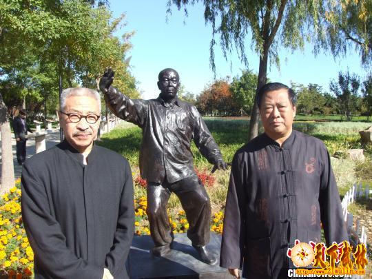 10月10日,由中国当代著名书画家梅墨生捐资铸造的“太极拳大师李经梧”铜像在河北省秦皇岛市揭幕。图为梅墨生(左)与太极拳名师项国员(右)一起在铜像前合影。 白云水 摄