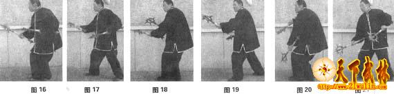 以两脚为轴,身体右后转180度,重心移于右腿,右脚过左脚向前迈进口—步置于左脚前呈左虚灵步束身势,右手持鎲随转身由右向左横锉于右胸前,左手握鎲,手腕翻转,手心朝下,鎲头沿顺时针方向翻转,由右向左横锉于左胸前(图16)。上动不停,右脚向右前方踩出呈虎步,右手持鎲,手腕翻转,手心朝上,向右上前方横撕,左手握鎲向左后方回钩,两手呈对拉撕绵劲(图17)。承接上势,右脚前寸,重心移于右腿,左脚置于右脚前呈左虚灵步束身势,右手持鎲在上,手腕翻转,手心朝下,鎲头沿逆时针方向翻转,由左向右横锉于右胸前,左手握鎲在下,手腕翻转,手心朝上,鎲头沿逆时针方向翻转,由左向右横锉于左腹前(图18);上动微停,左脚向左前方踩出呈虎步,左手握鎲,手腕翻转,手心朝上,向左上前方横撕,右手持鎲向右后方回钩,两手呈对拉撕绵劲(图19)。